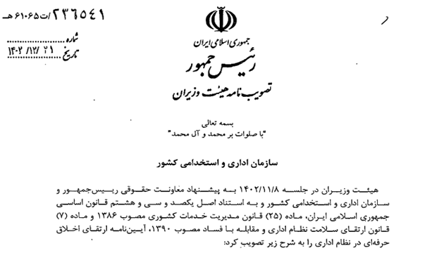 هیات وزیران در جلسه 1402.11.08 به پیشنهاد معاونت حقوقی رئیس‌جمهور و سازمان اداری و استخدامی کشور و به استناد اصل یکصد و سی و هشتم قانون اساسی جمهوری اسلامی ایران، ماده (25) قانون مدیریت خدمات کشوری مصوب 1386 و ماده (7) قانون ارتقای سلامت نظام اداری و مقابله با فساد مصوب 1390، آئین نامه ارتقای اخلاق حرفه‌ای در نظام اداری را تصویب کرد.