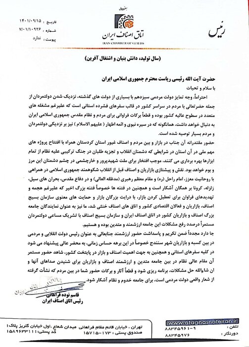 وی در بخش پایانی نامه خود با تأکید بر اینکه ما به عنوان نمایندگان جامعه بزرگ اصناف و بازاریان کشور در اتاق اصناف ایران و سازمان بسیج اصناف با تشریک مساعی دولتمردان مستمراً در صدد رفع مشکلات این جامعه ارزشمند و متدین بوده و هستیم، ضمن تکریم و پاسداشت حضور ارزشمند رئیس دولت انقلابی و مردمی در بین کسبه و بازاریان شهر سنندج خصوصاً در این برهه حساس زمانی، به رئیسجمهور پیشنهاد کرد در سفرهای استانی و همچنین به جهت اهمیت اصناف و بازار در پایتخت کشور، برای حضور مستمر در بین جامعه اصناف و بازاریان برای شنیدن صداهای آنها و حل مشکلاتشان برنامهریزی شود و تأکید کرد: قطعاً آثار و برکات حضور شما در بین مردم که نشأت گرفته از شعار واقعی دولت مردمی است، برای جامعه خدوم و نظام بیش از پیش آشکار خواهد شد.
