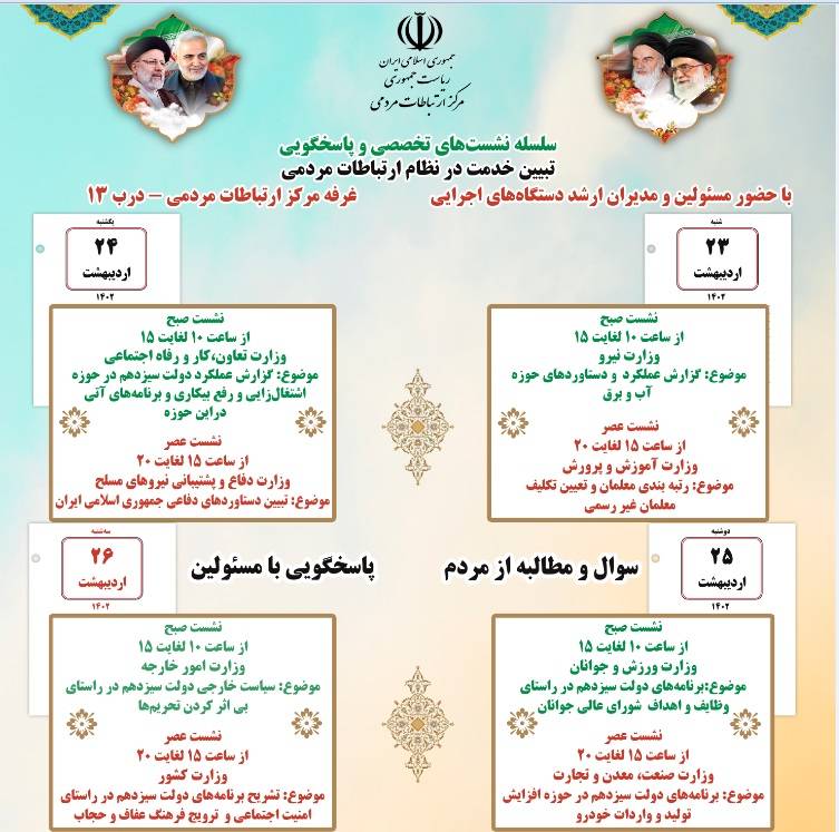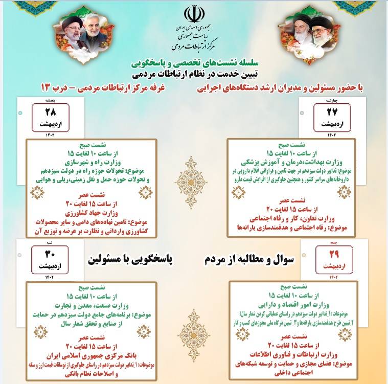 اعلام برنامه حضور مسئولین و مدیران ارشد دستگاههای اجرایی در نشستهای تبیین خدمت در غرفه مرکز ارتباطات مردمی تاریخ خبر: // کد خبر : 620 گروه خبری : اخبار مرکز جدول حضور مسئولین و مدیران ارشد دستگاههای اجرایی در غرفه مرکز ارتباطات مردمی درب شماره ۱۳ نمایشگاه بینالمللی کتاب بدین شرح است: