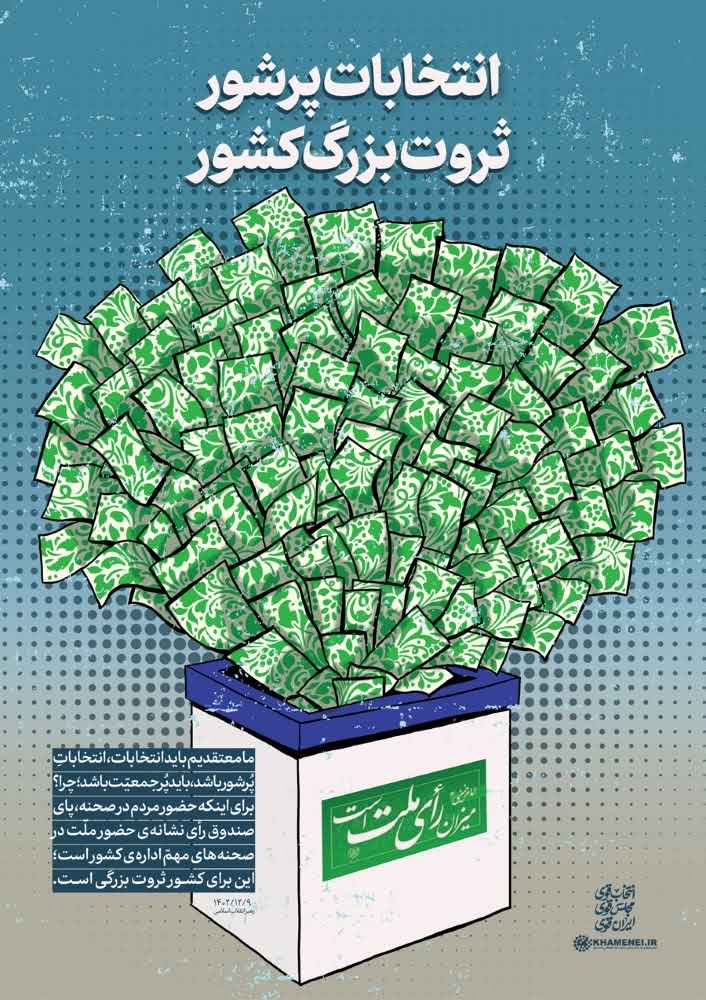 حضرت آیتالله خامنهای: «ما معتقدیم نه، باید انتخابات، انتخاباتِ پُرشور باشد، باید پُرجمعیّت باشد؛ چرا؟ برای اینکه حضور مردم در صحنه، پای صندوق رأی نشانهی حضور ملّت در صحنههای مهمّ ادارهی کشور است؛ این برای کشور ثروت بزرگی است.» ۱۴۰۲/۱۲/۰۹